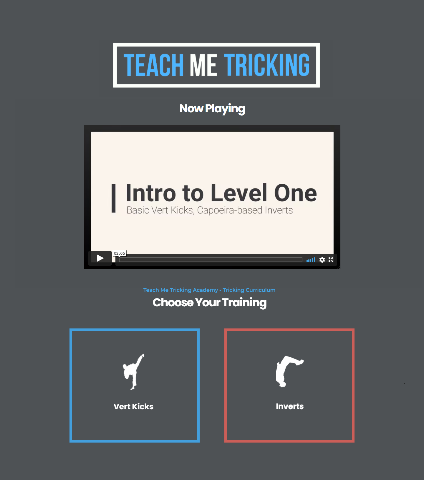 Teach Me Tricking is based on my Cinematic Martial Arts program; it's a structured curriculum for learning tricking with levels like in the martial arts. There is no special equipment, spotting, or crashing required. CMA uses safe, structured progressions to eliminate fear and reduce the risk of crashing. instead of being told how to do a complicated movement such as a butterfly twist, students are equipped with the knowledge of concepts necessary to help teach themselves new skills (every new skill is built from one you've already learned, beginning with very simple exercises). The techniques are structured into levels, with each one building toward more dynamic and difficult material.